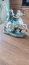 graziosa statuetta di una fatina con le ali blu, estraibili, su un cavallo bianco