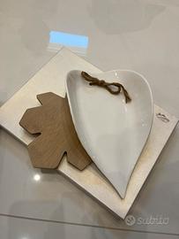 Antipastiera in porcellana bianca a forma di cuore con piccolo tagliere a forma di foglia in legno. Confezionato con all’interno sacchetto con confetti . Disponibili 39 pezzi sigillati, prezzo 12€ cadauno