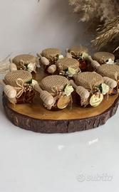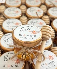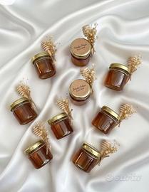 Delizioso vasetto di miele artigianale, perfetto come bomboniera per matrimonio. Un dolce ricordo per gli ospiti, realizzato con cura e decorato in stile elegante e romantico. Include cucchiaino in legno e sigillo decorativo.