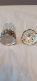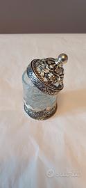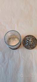 BARATTOLINO VETRO E METALLO ARGENTO ANTICATO ALTO CIRCA CM.9 E DIAMETRO CM. 5.
