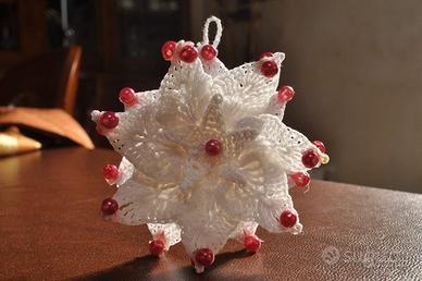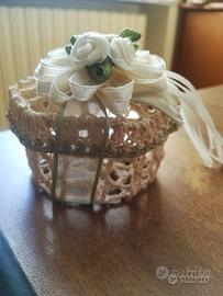 Vari articoli lavorati all'uncinetto con cotone fine (color bianco/beige). Bomboniera: Cestino con bottiglietta (OLIO) rivestita da "SPOSO" e con barattolino (MIELE) rivestito da "SPOSA". Inoltre, Stella Natalizia con perline rosse. Su richiesta, altri articoli e altre tipologie di lavoretti con cotone o lana. Uso Bomboniere, Segna posti, Addobbi, Soprammobili ecc. ecc. Prezzo da concordare in base all'articolo.