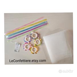 Kit fai da te 40 pezzi per confezionare Bomboniere. Il Kit comprende: 40 pezzi quadrati di tulle bianco giá tagliati (30x30cm) per poter confezionare con fantasia il sacchetto, 40 pezzi ciondolo "acchiappasole" realizzato a mano, di vari colori: 8 rosa cangiante, 8 giallo cangiante, 8 azzurro cangiante, 8 lilla cangiante, 8 verde cangiante. 40 nastrini già tagliati abbinati a ogni colore. Adatte per Comunioni, Cresime, Battesimi, Evento Nascita, compleanni, diciottesimi. Confetti non compresi!