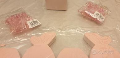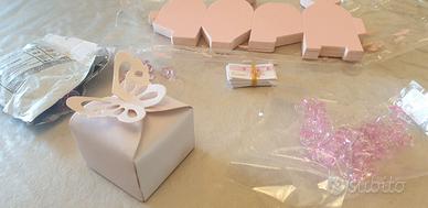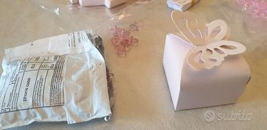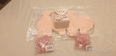 Vendo n.38 scatole x bomboniere in occasione di nascita, di colore rosa perlato a forma di farfalla in cartoncino da assemblare (misure circa cm 6x6 ed altezza di 5 cm) capienti abbastanza da contenere le confettate. Facilissime da montare, ci vuole un po' di attenzione soprattutto nello staccare i pezzettini dalle ali della farfalla. In abbinamento da includere insieme ai confetti dei simpatici ciucci rosa (n.76) di cm 2 di lunghezza in plastica trasparente di buona qualità. Tutto in blocco ad euro 20,00. Disponibile alla spedizione (gestita da subito.it).