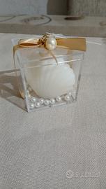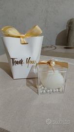 Vendo 10 bomboniere per occasioni speciali. Include una scatola regalo verde e bianca con fiocco dorato e la scritta Thank You, e una scatola trasparente con una candela a forma di conchiglia, perline decorative e nastro dorato.