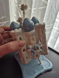 vendo bomboniere come da foto compreso di scatola e bottiglina di profumo che va inserita all'interno. La bomboniera è un profumatore a forma di castello, è ceramica pagata 28 euro. pezzi disponibili circa 20