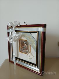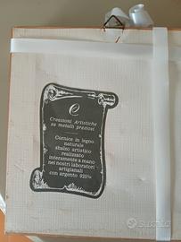 bomboniere di nozze preziose stampate su argento per invitati speciali. quadretti da 20 x 20 cm cornici in legno laccata bordo oro. Stampa raffigurante la sposa che prepara il vestito dipinto e stampato su argento. sono state prodotte in più. ce ne sono 18, un regalo ricordo prezioso che si dà ad amici o testimoni di nozze per ricordare il matrimonio per sempre!