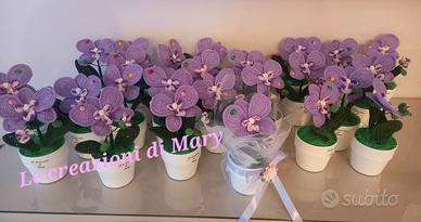 Elegante orchidea realizzata interamente a mano all’uncinetto, curata nei minimi dettagli. I petali sono lavorati con filato di qualità e rifiniti con particolari decorativi al centro del fiore. La composizione viene confezionata in un grazioso vasetto con tulle e fiocco coordinato.