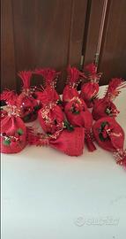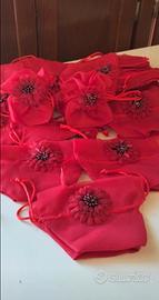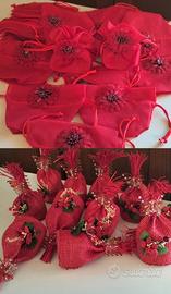 Sacchetti rossi (24 morbidi+12 rigidi) portaconfetti, comunemente utilizzati come bomboniere per eventi celebrativi. La presenza di un'applicazione a forma di fiore tono su tono con petali in tessuto suggerisce un design elegante, tipico per ricorrenze specifiche. Gli altri (12) sono rigidi a trama intrecciata con decorazione di fiori finti e mollettinr a forma di Farfalla 🦋 Utilizzo e Occasioni In base al colore e allo stile, questi sacchetti sono ideali per: Laurea: Il rosso è il colore tradizionale per questo traguardo; spesso vengono riempiti con 5 confetti rossi al cioccolato o alla mandorla. Cresima: Vengono utilizzati come piccoli doni per gli invitati, talvolta personalizzati con bigliettini interni. Segnaposto o Idee Regalo: Possono contenere piccoli bijoux, regali fatti a mano o essere usati come decorazione per la tavola durante le feste. Materiale: l realizzati in organza/tulle Chiusura: Dotati di un pratico tirante o coulisse che permette di chiudere il sacchetto semplicemente tirando i nastrini laterali. (Non ne ho altri, trattasi ti rimanente varie cerimonie) Totale 36 pezzi a 25,00 (anche vendita a kit di 12 a €9,00)