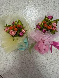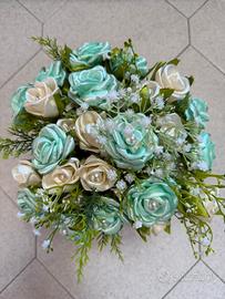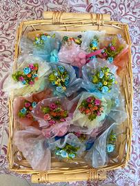Si eseguono composizioni fatte a mano in raso di bomboniere, bouquet, centri tavola per cerimonie con allestimenti e colori a piacere