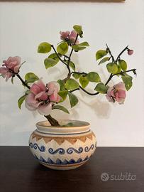 Arte giapponese Bonsai in vetro con vaso Dipinto paesaggistico giapponese su juta tesa da laccetti intrecciati ad una cornice in legno