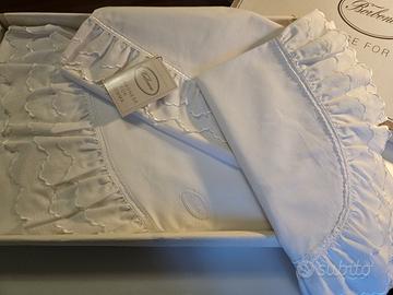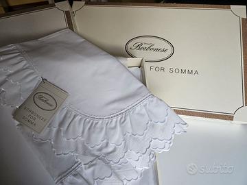Completo letto matrimoniale firmato Borbonese For Somma - garanzia di eleganza e raffinatezza - in raso di puro cotone, composto da lenzuolo per sotto, lenzuolo per sopra e n. 2 federe a tre volani, rifinito a tre balze in batista di cotone.