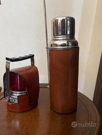 Borraccia termica in cuoio con supporto per auto e lampadina tascabile.