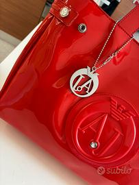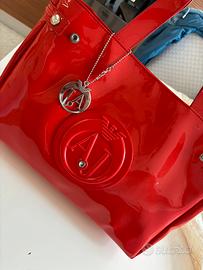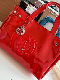 Borsa grande rosso Armani Jeans 100% autentica Dalla casa di Armani, ecco questa fantastica borsa grande. La borsa Fabulous è realizzata di colore rosso e hardware in metallo argentato. Questa borsa abbastanza spaziosa presenta un grande logo in gomma sul davanti, parti metalliche con logo, un bottone a pressione regolabile sui lati, doppi manici piatti sulla parte superiore, un grande disco con logo in metallo sul davantı e chiusura magnetica a scatto. Fodera in tessuto rosso con cerniera e due tasche applicate Ottime condizioni poiché usata solo una volta.