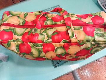 BORSA PORTA LAVORO MAGLIA E UNCINETTO, BELLISSIMA FANTASIA DI MELE SUI TONI DEL VERDE E ROSSO CON CHIUSURA DI CERNIERA LAMPO DUE MANICI SEMPRE IN TESSUTO E INTERNO PLASTIFICATO PER NON ALTERARE CON UMIDITÀ LE LANE O I LAVORI.
