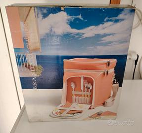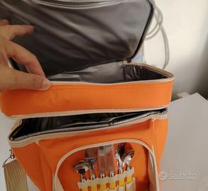 Bel tessuto pesante impermeabile. Con doppio scomparto sopra, + scomparto con 2 piatti di plastica, posate acciaio per due, tovaglioli di stoffa. Cintura lunga regolabile.