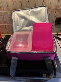 Borsa termica colore fucsia misure 27x38x11 cm contenente n. 2 contenitori misura 17x24x10 cm che vanno sia in lavastoviglie che nel microonde. Il tutto nuovo mai usato vendo a € 15 causa inutilizzo. No scambi, no perditempo