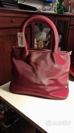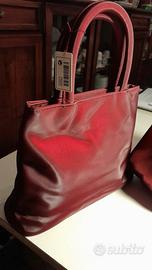 Due borse con modelli diversi. Una mano con doppio manico finitura liscia e lucida alla forma rettangolare con chiusura zip superiore. Invece l'altra è una borsa cosmetica coordinata alla borsa con i due manici. Entrami realizzati in un materiale sintetico con un color rosso rubino cangiante sono piccoli ma molto, molto carini sono della Yves Rocher Sono entrambe nuove.