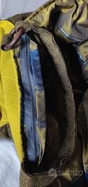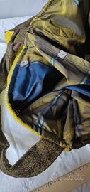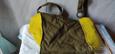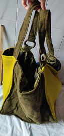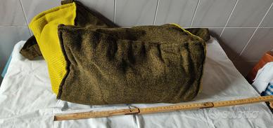 Vendo borsone vintage colore marrone/giallo marca Fucsia in ottimo (perfetto stato) molto particolare il materiale esterno e le maniglie richiamano la stoffa pesante di un vecchio paltò/tabarro, l’interno è un tessuto molto particolare tipo nylon/sintetico. E’ un borsone molto capiente, senza chiusure con una tasca con cerniera laterale interna e una tasca laterale interna con due bottoni magnetici. Le dimesioni approssimative sono borsa chiusa 31x31cm spessore circa 9cm, aperta ovviamente le misure sono le stesse, circa 31x31x31 ma si può adattare in lunghezza o larghezza essendo un tessuto morbido, lunghezza manici circa 25cm., peso oltre 500gr. Prodotto molto Vintage e praticamente unico. Sono disponibile alla spedizione con il servizio integrato di tuttosubito, per cui le eventuali spese di trasporto sono a carico acquirente, come di consueto, è un servizio davvero pratico e con dei buoni prezzi, basta simulare la proposta di acquisto per verificare.