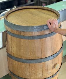 Botte vino inrovere ,con listelli e fascie zincate originali modificata per poterla appoggiare a un banco da bar , mobile da casa , tavolo ecc…