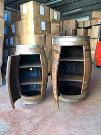 Botti in legno, ideali come espositori per negozio o come elementi di arredamento rustico. Ogni botte è dotata di uno sportello frontale con ripiani interni, perfetti per organizzare o mostrare prodotti e oggetti.