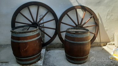 Come da foto 2 ruote diametro 150 pesanti a 300? e 2 botti 150? altezza 1 mt della ditta bosco. Presi tutti assieme 350? Trattamento antitarlo effettuato..ideale per pub masserie ecc.