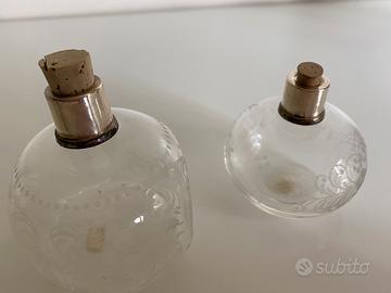Bottiglia boccetta profumo antica, stile Liberty, da collezione, in vetro molato con decorazioni. Tappino in sughero e tappo in argento.
