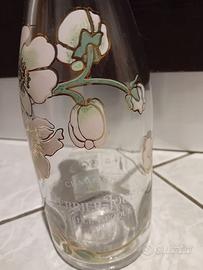 Bottiglia in vetro vuota di Champagne Belle Epoque Rosé di Jouet Perrier molto carina per farne un abat-jour o lampada da salotto. Il celebre decoro floreale è realizzato con i seguenti materiali e tecniche: Lo Smalto Vetrificato Materiale: I fiori (anemoni giapponesi) sono realizzati in smalto bianco e oro, applicato direttamente sul vetro della bottiglia. Tecnica: Si tratta di una serigrafia a smalto (o smaltatura a caldo). Origine d'arte: Il disegno originale fu creato nel 1902 da Émile Gallé, uno dei massimi esponenti dell'Art Nouveau. Egli dipinse a mano quattro magnum con smalto vitreo.
