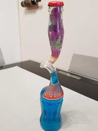Vendo bottiglia coca cola con collo attorcigliato, contenente liquido blu e un fiore sintetico all'altezza del tappo. È alta 29 centimetri. Molto bella e in perfette condizioni, anni 80