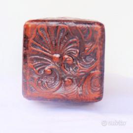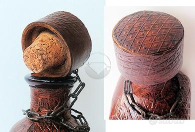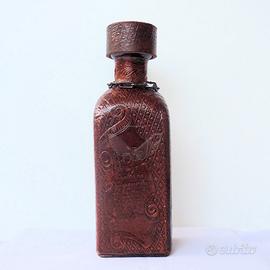 Bottiglia in vetro da liquore ricoperta in pelle goffrata. Articolo tardo Art déco.