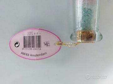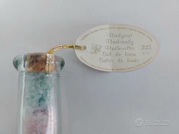 Bottiglia di vetro trasparente a forma conica riempita con strati orizzontali di sali da bagno colorati, disposti in strati distinti di vari colori, che ricordano la sabbia decorativa.