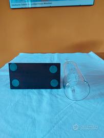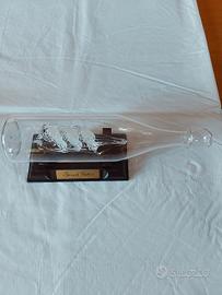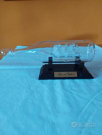 Bottiglia in vetro con inserito un veliero con sostegno In legno Lunghezza bottiglia 23 cm diametro bottiglia 5,5 cm base di legno 13,5 cm larghezza 7 cm