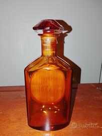 Bottiglia in vetro color ambra, con tappo sagomato. Altezza 17 cm circa, larghezza 7 cm. In ottime condizioni.