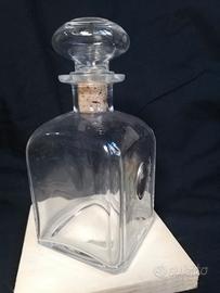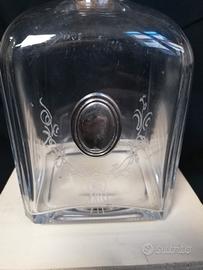 Bottiglia in vetro con tappo in sughero intatto, con medaglione in argento e superficie decorata, condizioni perfette, misure base cm 9x9 e altezza cm 16