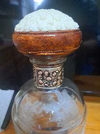 Bottiglia da liquore in vetro e legno. Decorata. Come nuova.