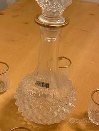 Bottiglia di cristallo con giro dorato e tappo e con sei bicchierini sempre in cristallo, anch'essi con giro dorato.