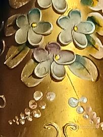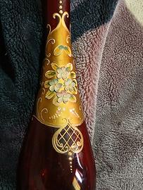 Bottiglia acquistata a Murano negli anni 59 ,decorata in oro zecchino dipinto a rilievo con smalto ,rosso veneziano il colore del vetro pezzo unico fatto a mano,anzi con le guance,il perfette condizioni ,è un oggetto che se comprato in fonderia x vetro è questo è stato preso da una bottega fi un artista,comunque non vi basterebbero 1000 euro.