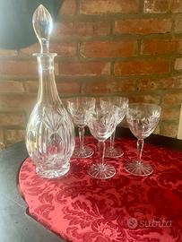 Vendo elegante set in cristallo composto da una caraffa/decanter con tappo lavorato e 4 calici coordinati. Il cristallo è inciso a mano con motivi geometrici e floreali, molto luminoso e di grande effetto. Perfetto come servizio da liquore, vino dolce o come oggetto decorativo per salotto, vetrina o tavola.