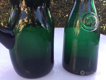Bottiglia e caraffa in vetro verde soffiato a mano di Empoli. Altezza caraffa/bottiglia 23cm.. Condizioni ottime, senza sbeccature o graffi..