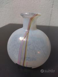 Bella bottiglia di pasta di vetro, con la pancia piatta, presenta fili di vetro colorato incastonati in un corpo bianco, il prodotto è fatto a mano,