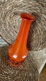 Bottiglia da collezione risalente agli anni ‘60- '70. Il design è una creazione artistica, attribuibile all’azienda Beccaro, nota per le sue bottiglie artistiche destinate al mercato dei liquori, in particolare per il vino liquoroso "Lacryma Christi". L'oggetto è realizzato in vetro laccato\colorato di colore arancio intenso e ornamenti in nero. Il corpo è decorato con un motivo in nero che ritrae delle colombe intorno ad ornamenti classici, elementi stilistici tipici di quel periodo.