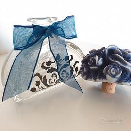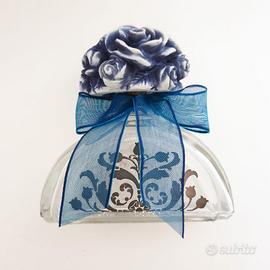 Bottiglietta in vetro con decori floreali in argento per liquore, rosoli oppure da usare come diffusore essenze. Dotata di tappo ermetico in sughero con testa decorata con rose blu. Made in Italy, comprata in negozio di argenteria, no cineserie.
