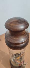 Bottiglia in vetro con tappo e base in legno, alta 38 cm.