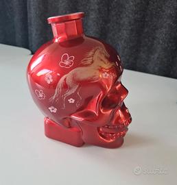 Bottiglia teschio rossa decorata per liquori o arredamento senza tappo. Nuova senza scatola.