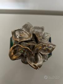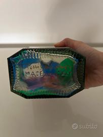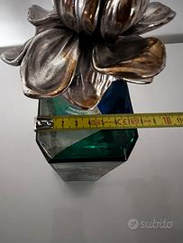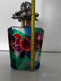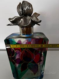 In vendita una splendida bottiglia artistica per profumo della celebre collezione "Crazy Dad", disegnata da Dado Torrigiani (Italia, anni '80/'90). Un pezzo di design iconico che unisce l'artigianato del vetro alla Pop Art italiana. Caratteristiche Principali: Design Unico: Vetro artistico sfaccettato con decorazione floreale (fiori di loto) interamente dipinta a mano con colori vibranti e contorni in rilievo dorati. Firma Autentica: Il pezzo presenta la firma originale dipinta a mano sotto la base, che ne attesta l'autenticità e la provenienza dalla collezione Torrigiani. Tappo Scultoreo: Elegante tappo a forma di bocciolo di fiore realizzato in argento finemente lavorato. Dimensioni: vedi foto Stato di Conservazione: Eccellente stato vintage. I colori sono lucidi e vividi, il vetro non presenta sbeccature. (Vedi foto per i dettagli). Questo oggetto non è solo una bottiglia, ma una vera e propria opera d'arte da esposizione. Perfetta per arricchire una collezione di vetri d'arte o come elemento d'arredo esclusivo per una toeletta raffinata. T2