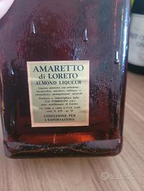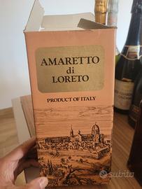 bottiglia vintage Amaretto di Loreto prodotto negli anni 70/80 per esportazione con scatola e pergamena, aperta e richiusa.