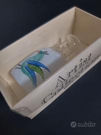 Bottiglia vintage in vetro soffiato artistico in miniatura colorato bianco con decorazione dipinta a forma di uccello.