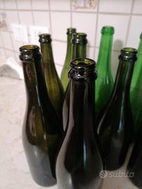 Set di 10 bottiglie di vetro verde, comunemente utilizzate per contenere vino o spumante.