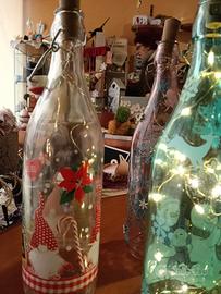 bellissime bottiglie a lanterna decorate con soggetti natalizi contenenti luci a batteria. 2 colori verde, 2 color rosato ed una trasparente. Perfettamente funzionanti. Vendibili singolarmente a €15 cadauno. Prezzo occasione se comprate in blocco €70 tutte