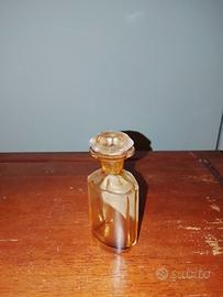 Vecchia bottiglietta in vetro con tappo sagomato. Altezza 9,5 cm, larghezza circa 4 cm. Residuo di olio essenziale di rosmarino all'interno. Se si vuole aprire, usare dell'olio o una fonte di calore, perché il tappo è leggermente incrostato.