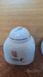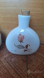 Bottigliette in ceramica smaltate. Set Valmusone in ottime condizioni. Pezzo vintage da collezione. Riportano scritta: Valmusone. Decorate con motivo floreale stilizzato in blu, rosa, verde. Decorate a mano. Bottiglietta quadrata (misura – 9x7x7cm), provvista di tappo rimovibile in ceramica. Bottiglietta allungata con tappo in sughero (misura – 12x10x4cm). Prezzo per la coppia, vendibile esclusivamente abbinata